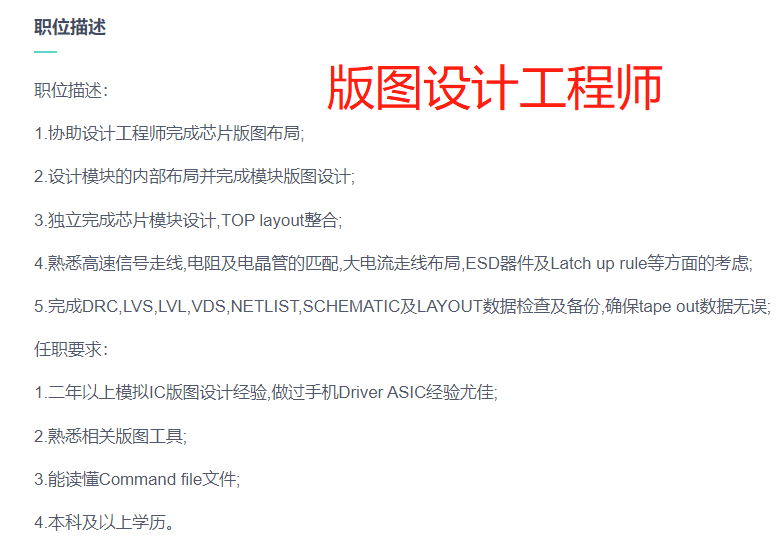 版图设计工程师是IC设计职位中要求最低的一个职位,本科生甚至专科生都有机会进入。