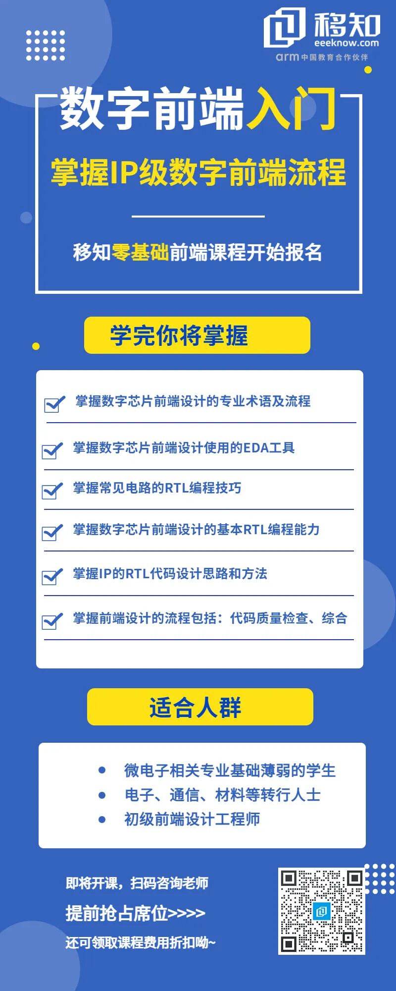 《芯片数字前端设计入门》大班课来了,本课程为基础薄弱的学生以及初入职场的工程师精心打造,通过理论+实验+项目的多维度学习方式,让学员由浅入深地掌握相关知识点和技能,成为一个合格的数字前端设计工程师。