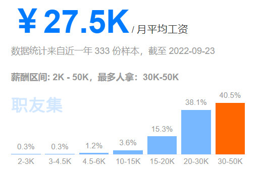 数字前端设计岗位是有钱途的,根据职友集采集的333份数据显示,今年数字前端设计的月平均工资在27.5K,其中30-50K工资占比最多,高达40.5%。随着国家的大力支持和资本的涌入,薪酬更是水涨船高。