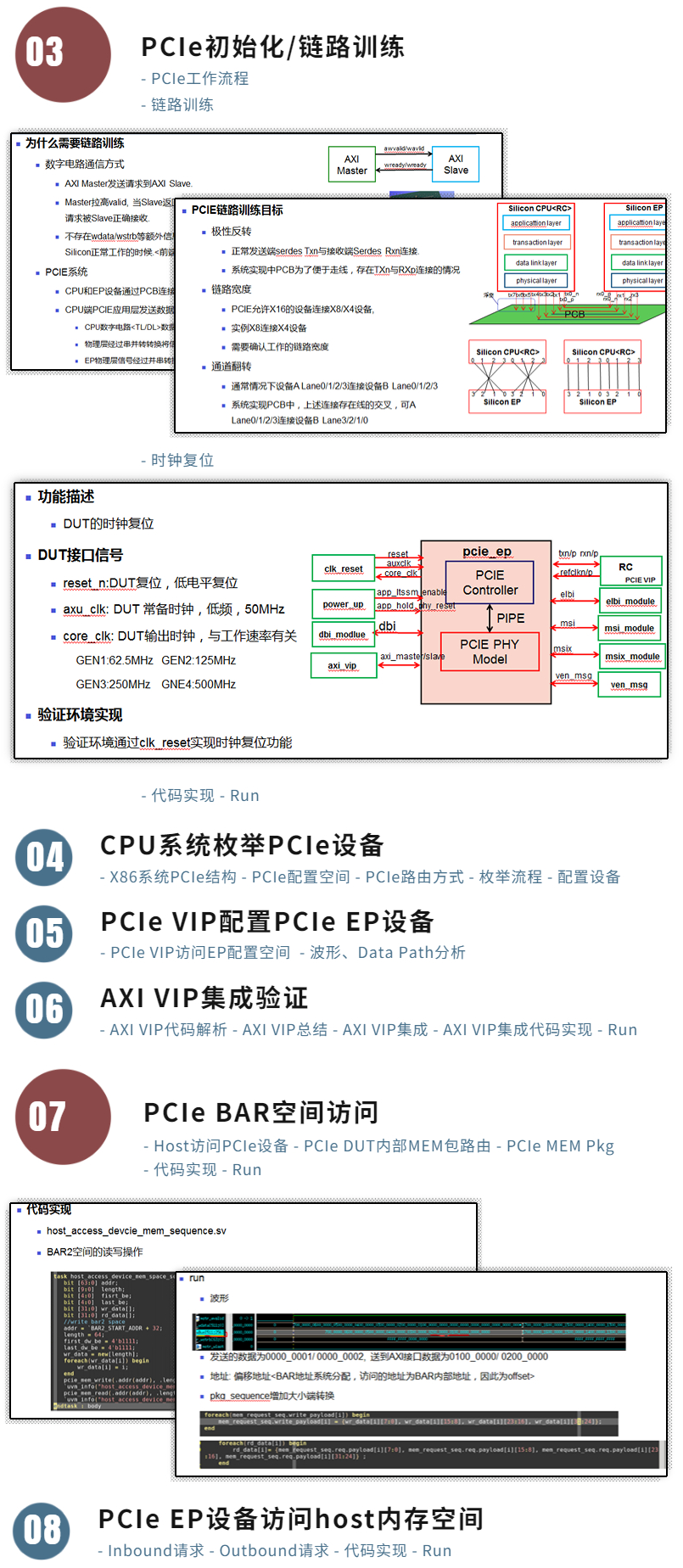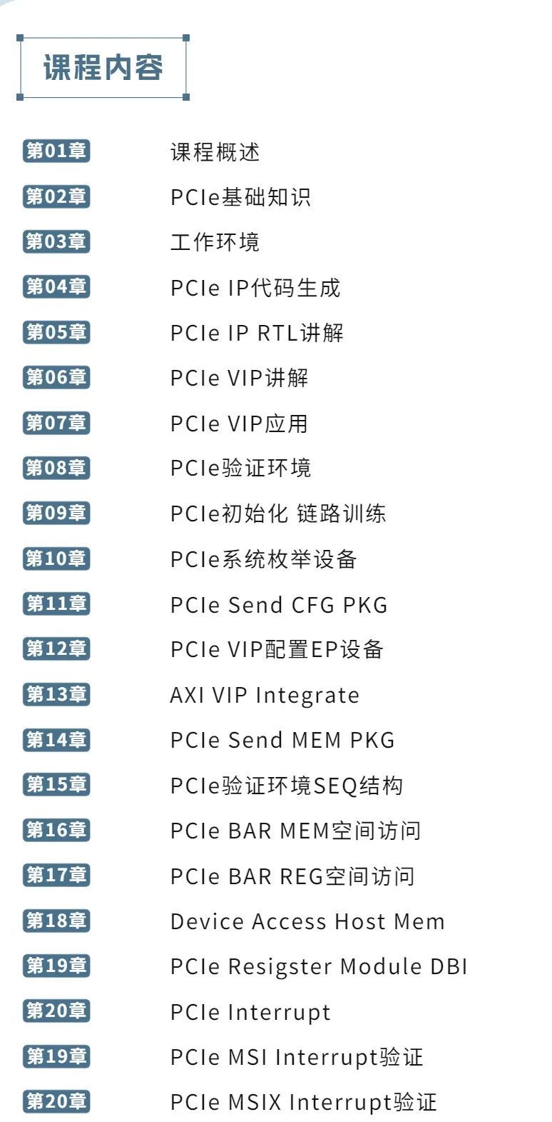 别担心,横跨两年,移知教育 新课升级《PCIe验证实战》,一课搞定设计和验证,本课程以可流片的PCIe代码为基础,介绍了PCIe理论以及PCIe实战的内容,目标是大家能在实际的PCIe项目中可以上手干活。共22个章节,理论和实战相结合,从验证环境的搭建,到DUT data path的梳理,学完即可上手做PCIe RTL设计以及验证工作。
