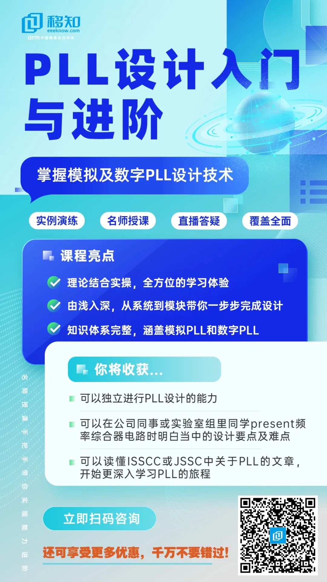移知教育移知特邀深耕于PLL设计领域,拥有7/14/28nm等多个项目的成功流片经验的Kevin博士,以实际的职场案例为演示切入点,应大家的需求设计了一款新课《PLL设计入门与进阶》。