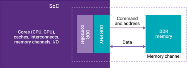 高性能 SoC 通常具有多个存储器通道。图示显示的简化 DDR 存储器可以是上述任何 DDR 类别的 DRAM 存储器。