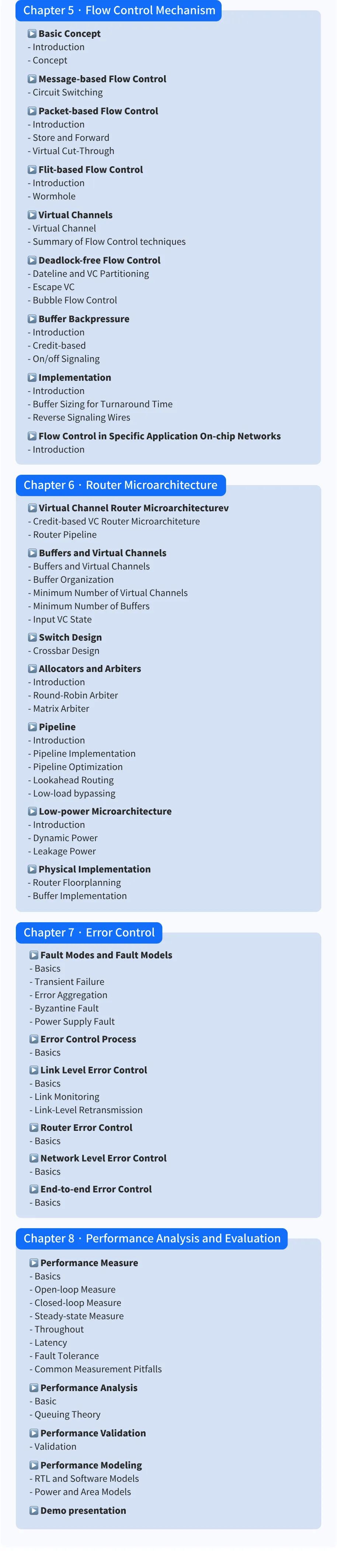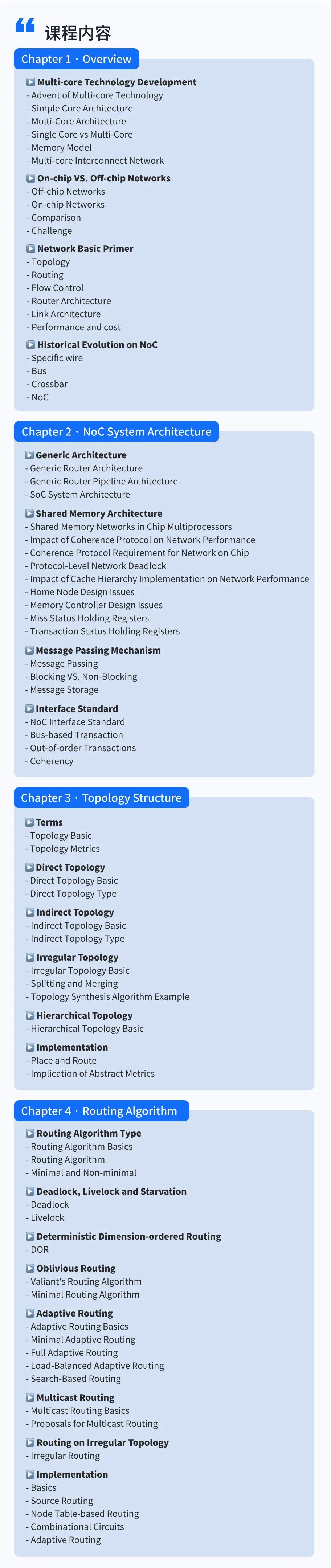 课程内容主要针对NoC原理和实现方法的基础介绍,分别从NoC概述、体系结构、拓扑结构、路由算法、流控机制、路由微架构、误码控制和性能分析评估八个维度详细阐述设计NoC所需的基本知识和实现方法,使学员能较全面地掌握NoC设计的方法。