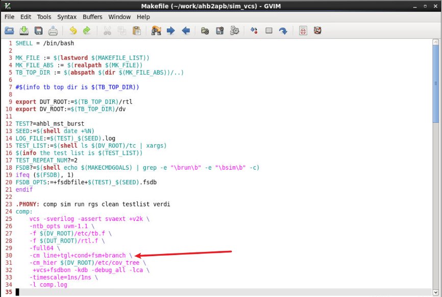 答案:此次收集了代码覆盖率,通过Makefile脚本中第30行代码收集的代码覆盖率,代码覆盖率包含了line,toggle,condition,fsm,branch这5种覆盖率综合得分得到的百分比覆盖率。